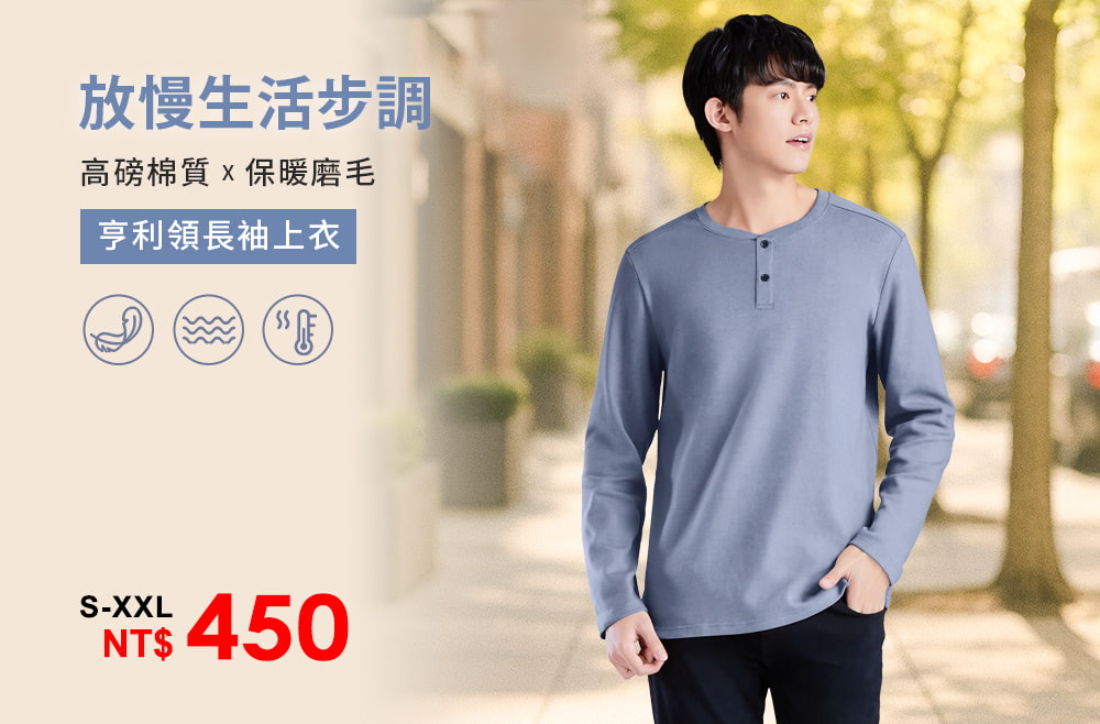 高磅棉質磨毛亨利領長袖上衣-男裝