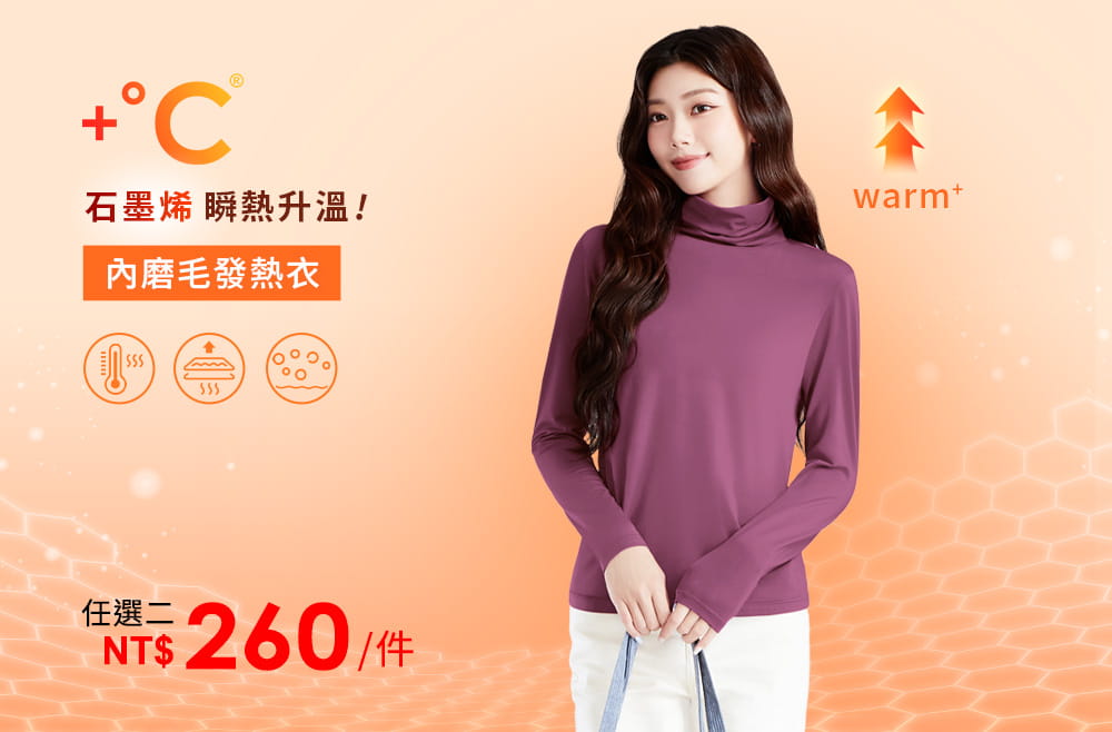 +℃ 超極暖.石墨烯.木耳捲邊發熱衣【任選二‧260件】升溫內磨毛發熱衣