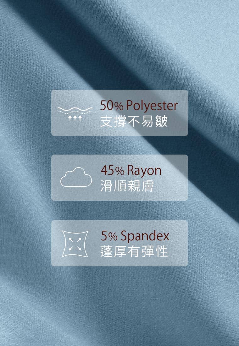 50%聚酯纖維、45%嫘縈、5%彈性纖維